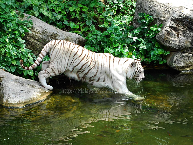 This beautiful majestic cat all in white with black stripes is actually a Bengal White Tiger which is one of the many here at the Singapore Zoo.