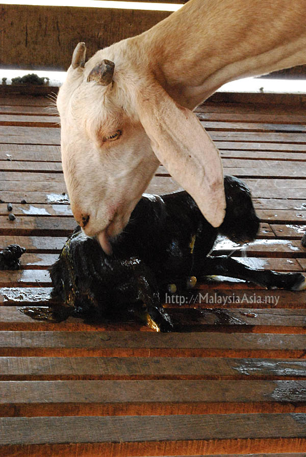 | The mother goat cleans the ‘kid’, a baby goat. |